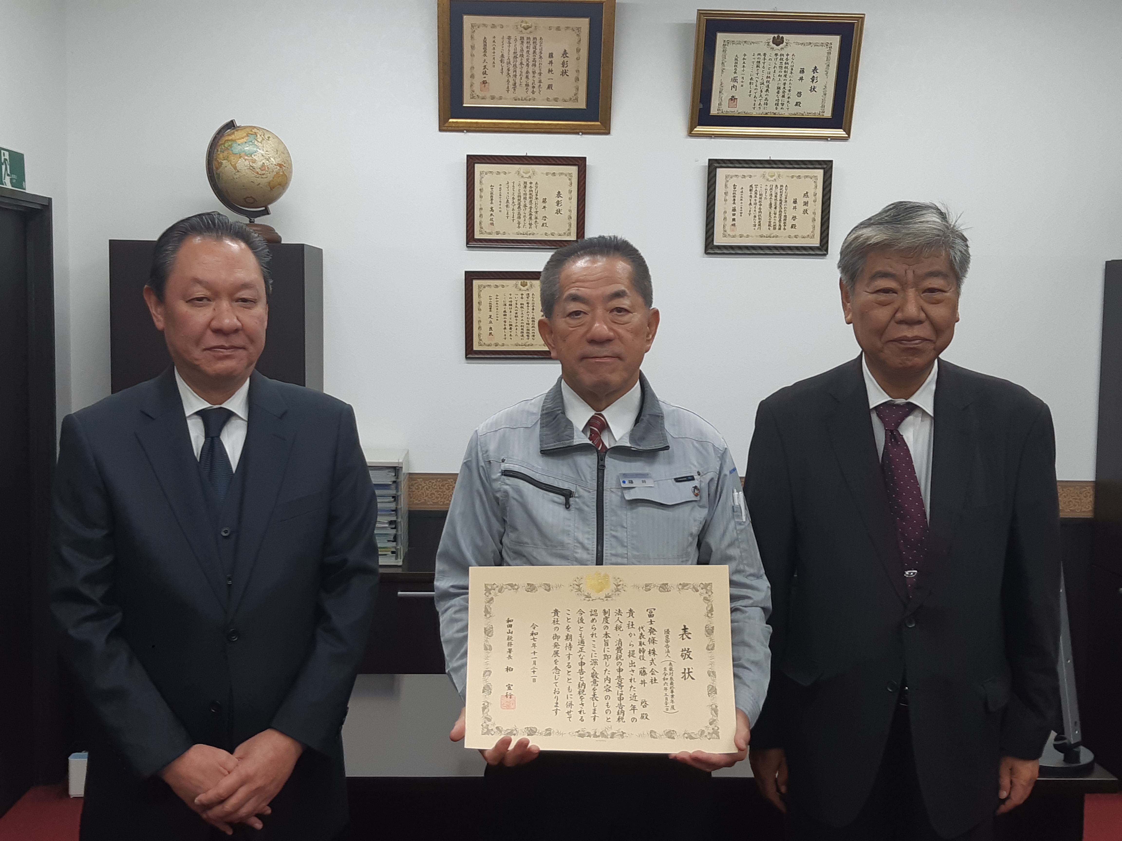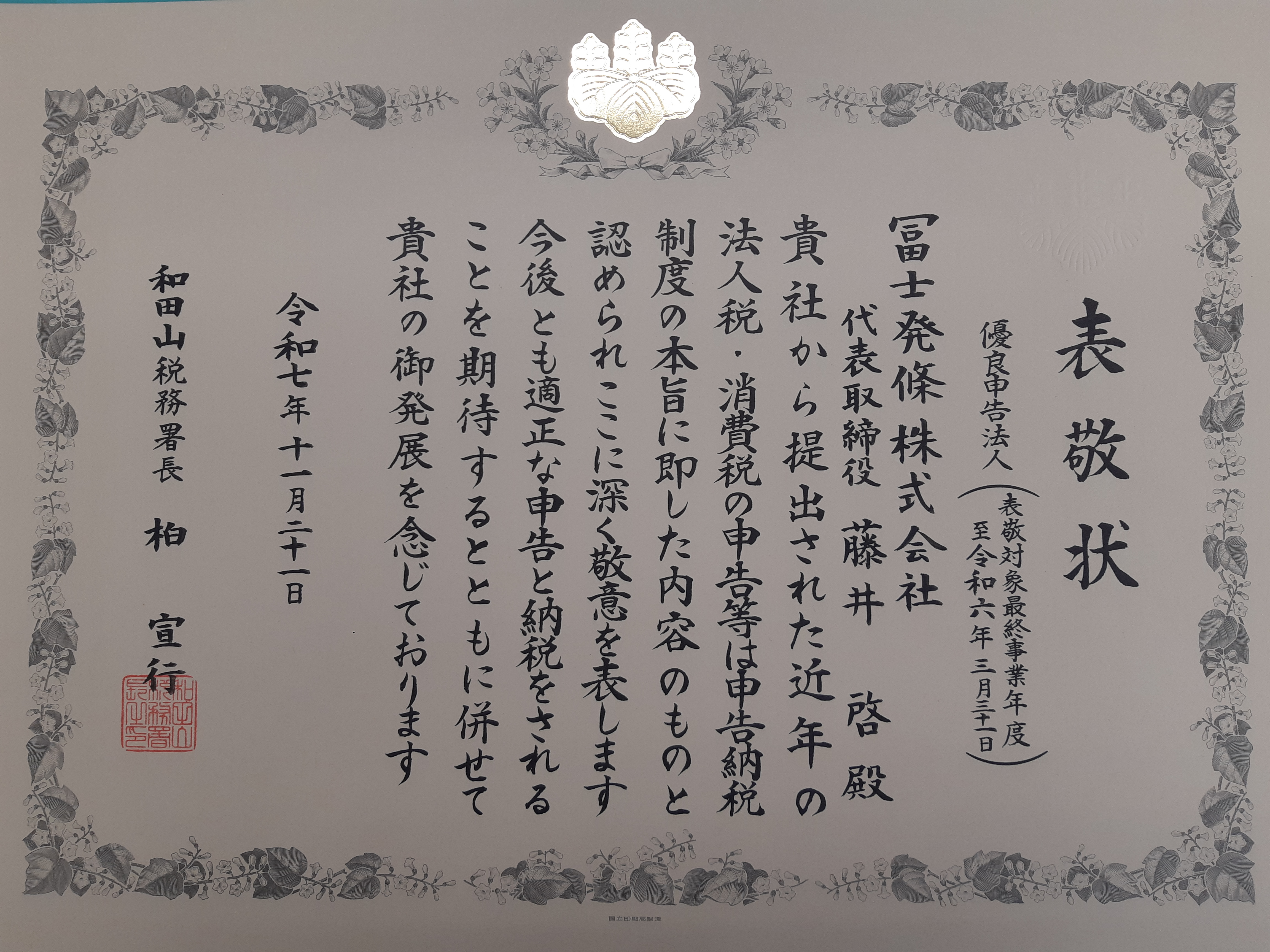 適正な経理処理と税務申告をご評価いただき、大変ありがたく、また表敬状を
